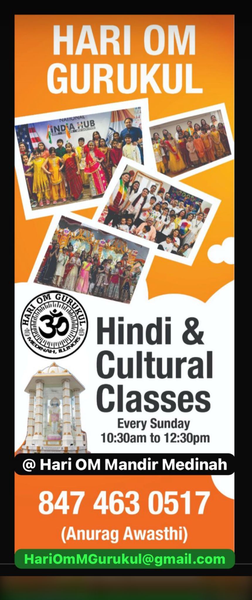 Hari OM Gurukul is a non-profit volunteer based wing of Hari Om Mandir and running Hindi Classes for Kids age 5yrs and plus. Hari Om Gurukul follows a curriculum that integrates materials from both Hindi - USA and VHPA's Bal Vihar. These organizations provide structured programs for teaching Hindi language and Hindu culture and values to children.